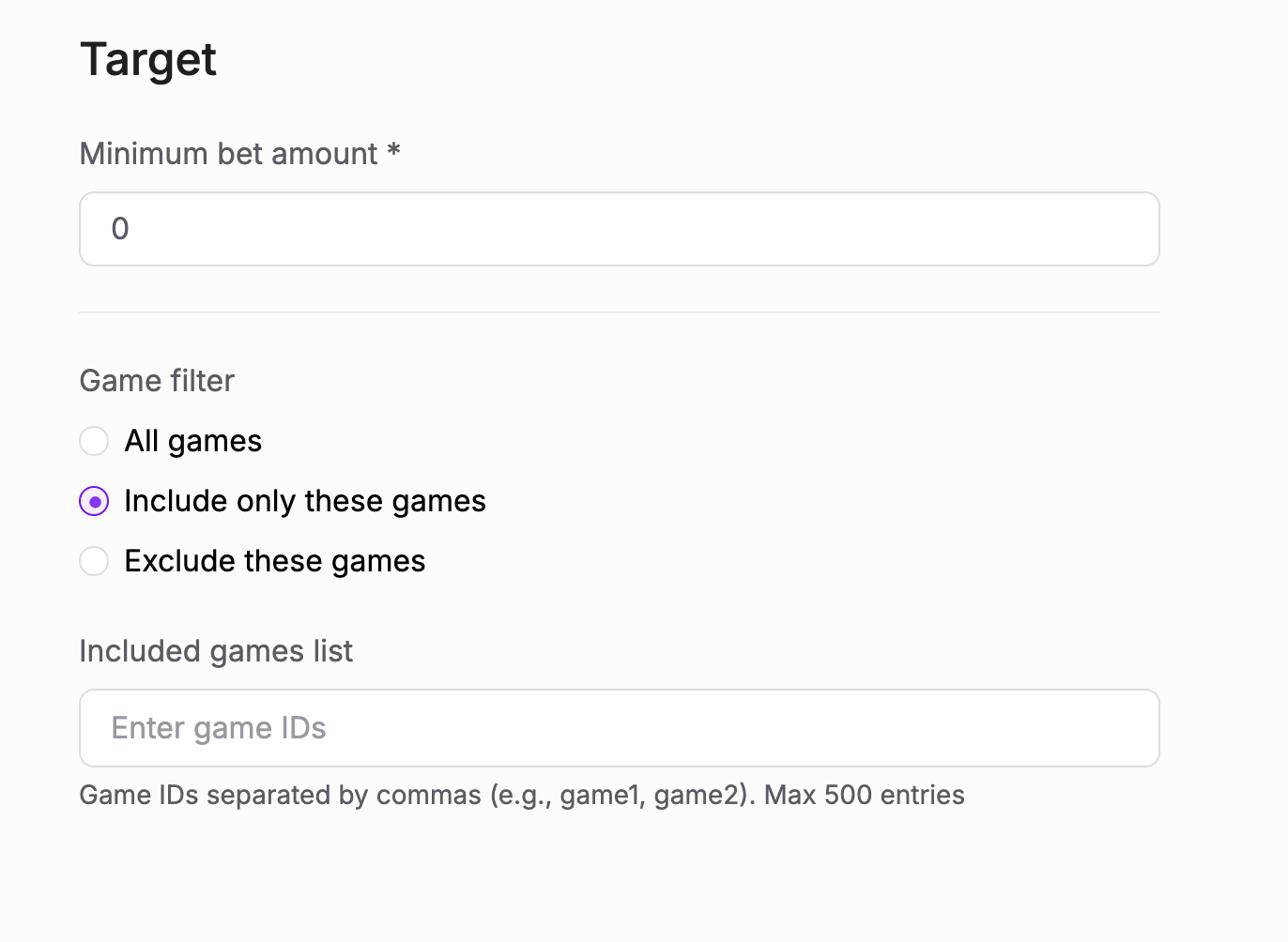 Set the minimum bet amount and define which games are included or excluded from your jackpot. You can target all games, include specific ones, or exclude certain titles.
